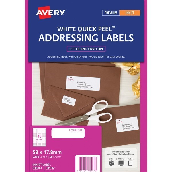 Avery 936111 J8156 Quick Peel Address Labels with Sure Feed Inkjet 58 x 17.8mm 45 Per Sheet Pack 50