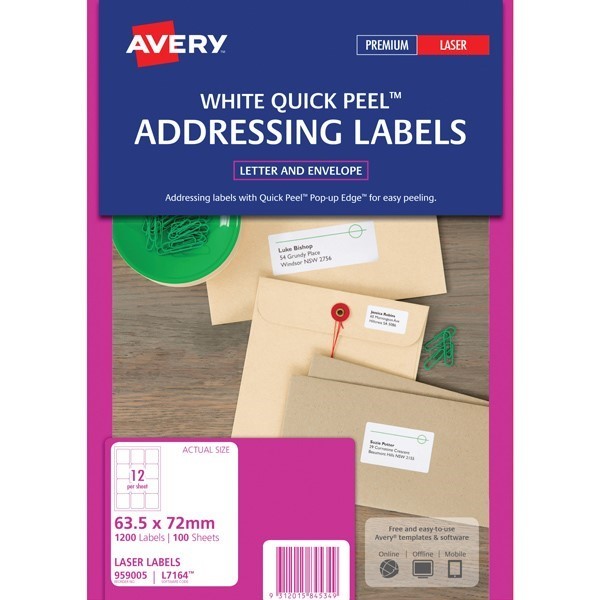 Avery 959005 L7164 Quick Peel Address Labels with Sure Feed Laser 63.5 x 72mm 12 Per Sheet Pack 100