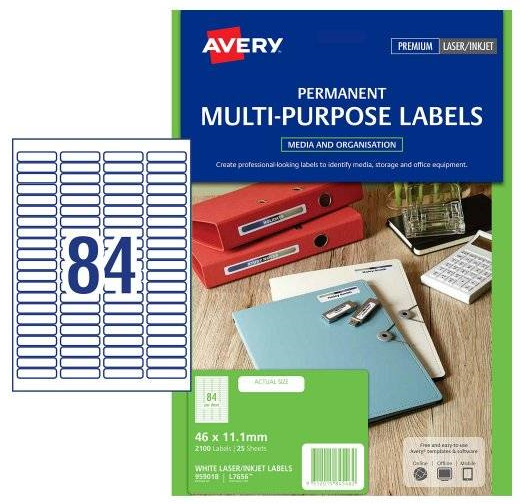 Avery 959018 L7656 Permanent Multi-Purpose Labels Laser Inkjet 46 x 11.1mm 84 Per Sheet Pack 25
