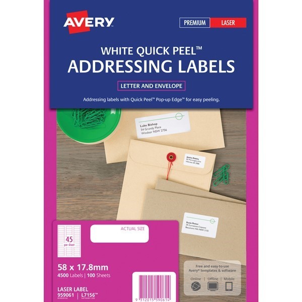 Avery 959061 L7156 Quick Peel Address Labels with Sure Feed Laser 58 x 17.8mm 45 Per Sheet Pack 100