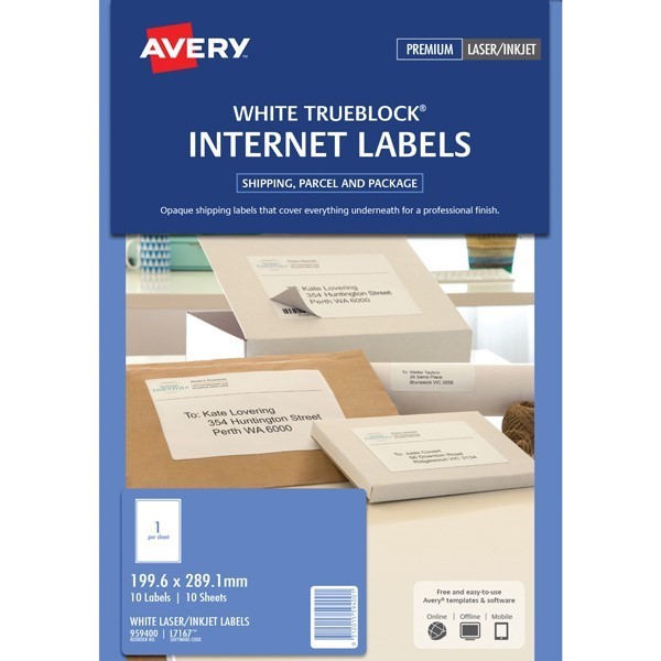 Avery 959400 L7167 Internet Shipping Labels Inkjet 199.6 x 289.1mm 1 Per Sheet Pack 10