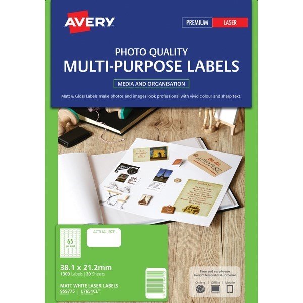 Avery 959775 L7651CL Matt Photo Quality Labels Laser 38.1 X 21.2mm 65 Per Sheet Pack 20