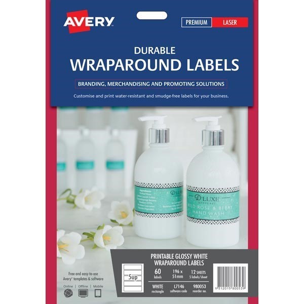 Avery 980053 L7146 Wraparound Labels Laser 196 x 51mm 5 Per Sheet Pack 12