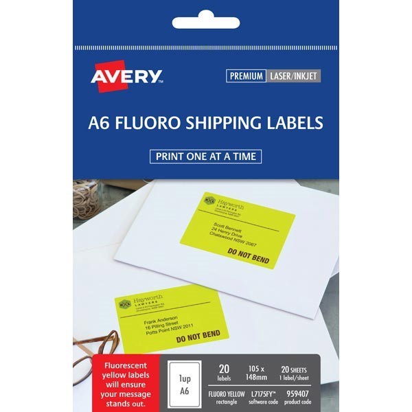 Avery Labels L7175FY 959407 Shipping A6 105 X 148Mm 1/Sheet Fluoro Yellow (Pkt/20)