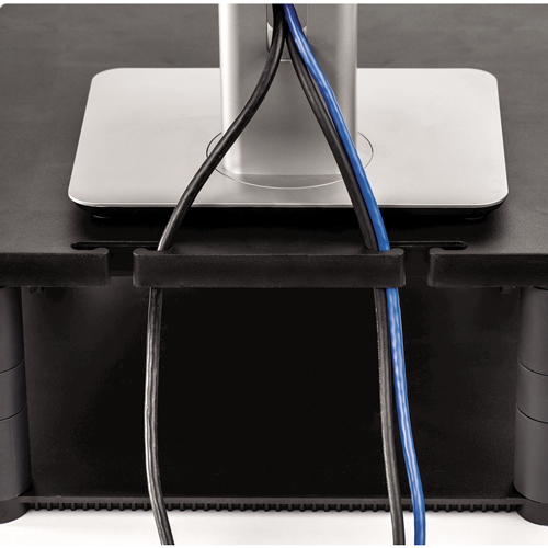 Positions the monitor at a comfortable viewing height and helps organise the workstation around the monitor