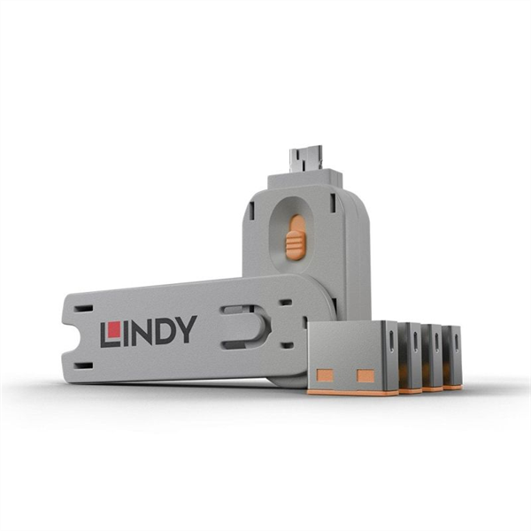 Lindy USB-A Port Blocker 4 Pack + Key Orange