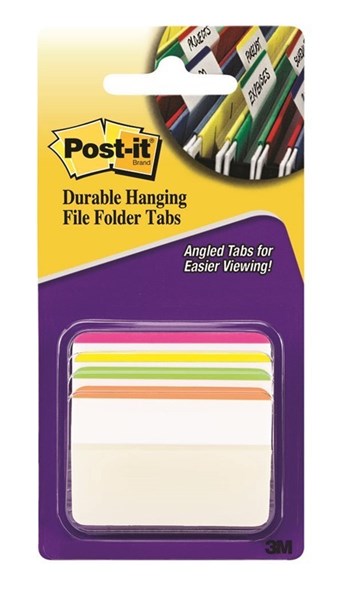 •Post-it® Tabs create order •Easily organise hanging file folders •Angled for easy viewing from above file drawers •Assorted Bright tabs give you flexibility to organise by colour •Durable, Writeable, Repositionable •Also great for binders, planners and notebooks •Sticks securely, removes cleanly