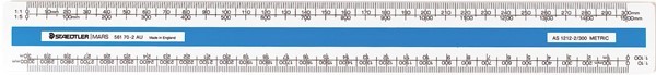 Oval scale ruler AS1212-2 300mm scales front: 1:1, 1:5, 1:10, 1:100 back: 1:20, 1:200, 1:50, 1:500.