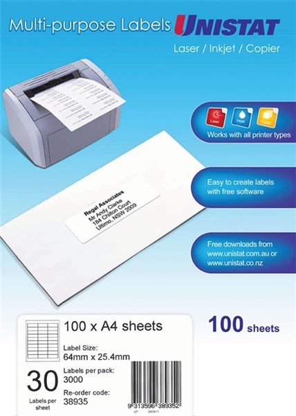 Unistat 38935 Laser Inkjet Copier Labels 64 x 25.4mm 30 Per Sheet Box 100