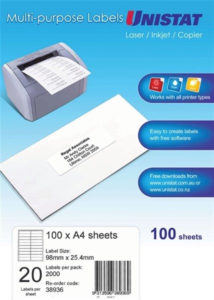 Unistat 38936 Laser Inkjet Copier Labels 98 x 25.4mm 20 Per Sheet Box 100