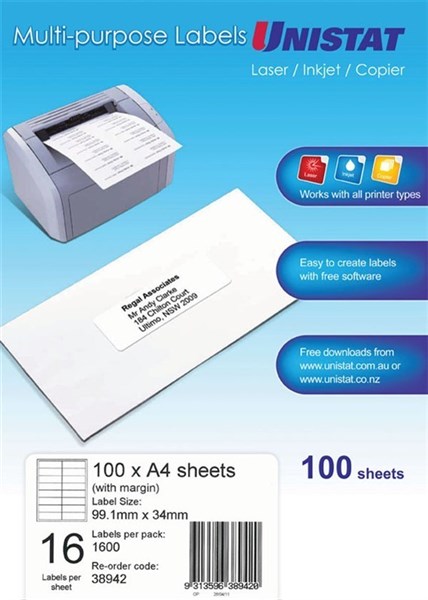 Unistat 38942 Laser Inkjet Copier Labels 99 x 34mm 16 Per Sheet with Margin Box 100