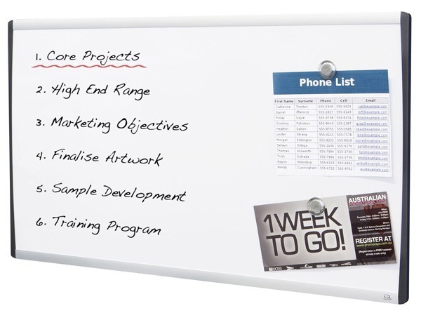The versatile whiteboard surface doubles as a magnetic board and features a lightweight aluminium frame