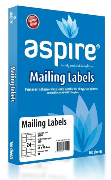 Aspire Address Labels Laser Inkjet 64 x 33.9mm 24 Per Sheet Pack 100