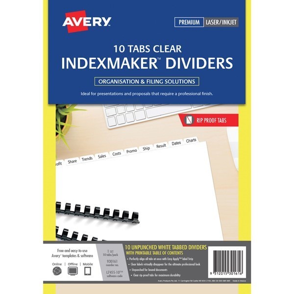 Each pack of Avery IndexMaker comes with dividers, reinforced table of contents page, Easy Apply clear laser and inkjet