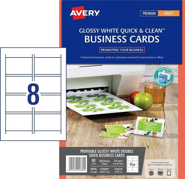 Avery 936229 Business Cards 8 per sheet C32028 Double Sided Glossy White Pack 10