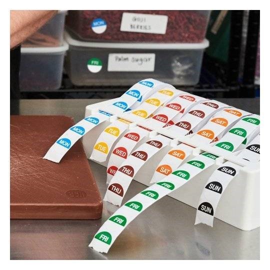Kit contains a plastic dispenser which holds 7 Day of the Week labels, Monday to Sunday 24mm round