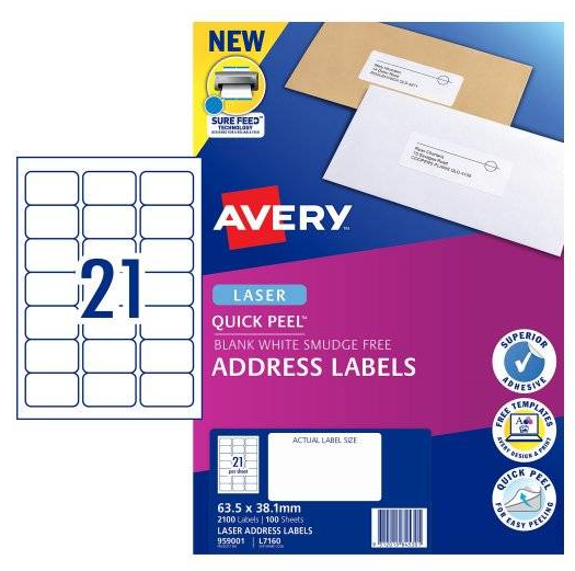 Avery 959001 L7160 Quick Peel Address Labels with Sure Feed Laser 63.5 x 38.1mm 21 Per Sheet Pack 100