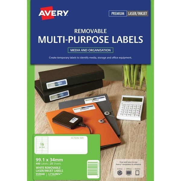 Avery 959048 L7162REV Removable Mulit-Purpose Laser Inkjet 99.1 x 34mm 16 Per Sheet Pack 25
