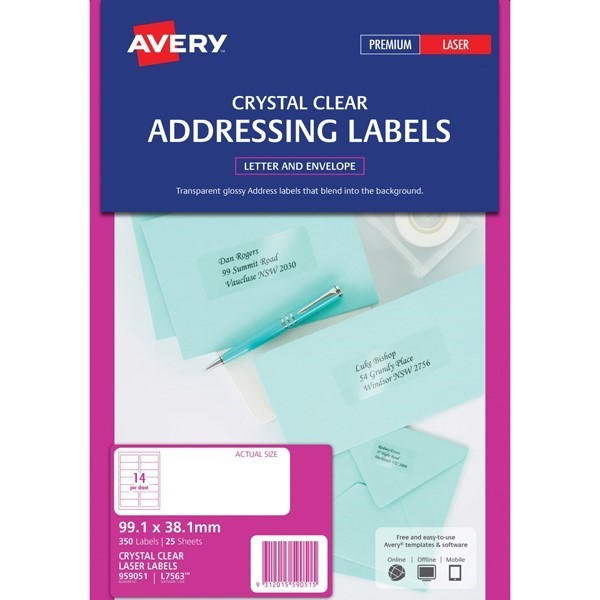 Avery 959051 L7563 Crystal Clear Address Labels Laser 99.1 x 38.1mm 14 Per Sheet Pack 25