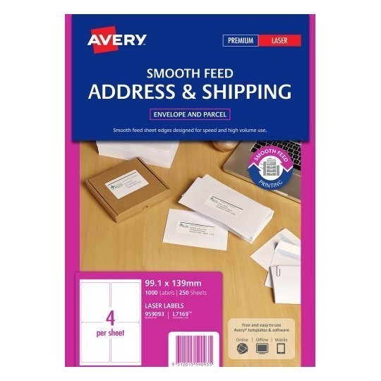 Avery 959093 L7169 Shipping Labels with Smooth Feed Laser 99.1 x 139mm 4 Per Sheet Pack 250
