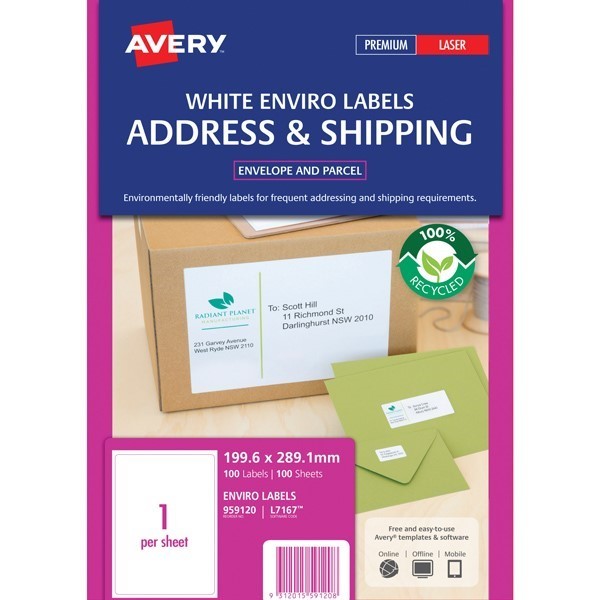 Avery 959120 L7167EV Eco Friendly Address Labels Laser 199.6 X 289.1mm 1 Per Sheet Box 100