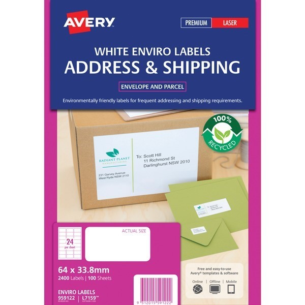 Avery 959122 L7159EV Eco Friendly Address Labels Laser 64 x 33.8mm 24 Per Sheet Box 100