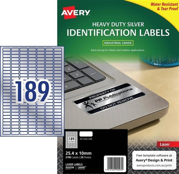 Avery 959200 L6008 Heavy Duty Labels Laser 25.4 x 10mm 189 Per Sheet Silver Pack 20