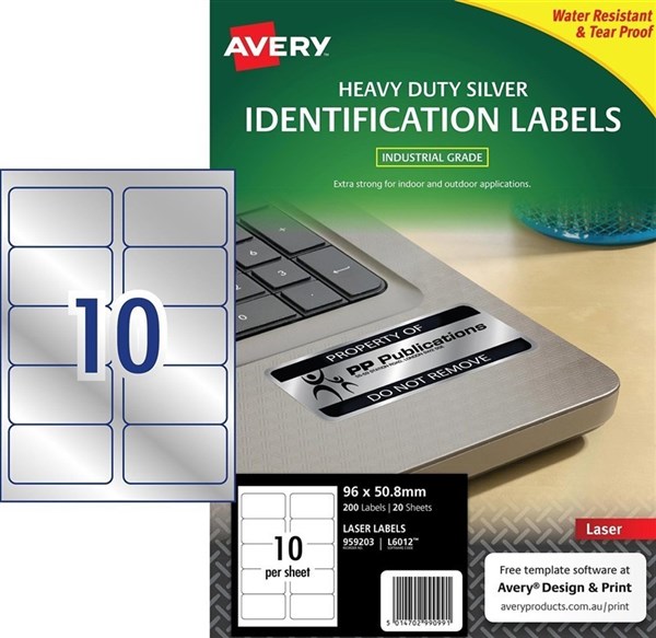 Avery 959203 L6012 Heavy Duty Labels Laser 96 x 50.8mm 10 Per Sheet Silver Pack 20