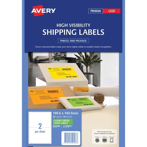 Avery 959408 L7168FG High Vis Shipping Labels Laser 199.6 x 143.5mm 2 Per Sheet Fluoro Green Pack 10