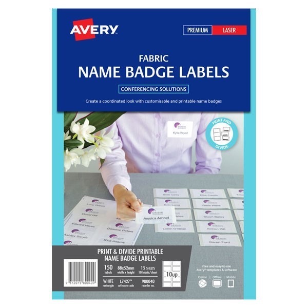 Avery 980040 L7427 Fabric Name Badge Labels Laser 88 x 52mm 10 Per Sheet 15 Sheets