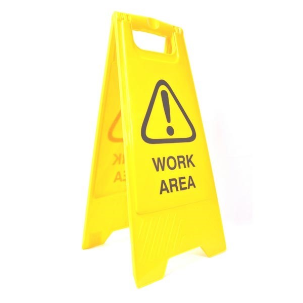 Cleanlink Safety Sign "Work Area" is a light weight flat fold A-frame in bright yellow, drawing attention to ensure safety.