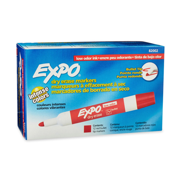 Expo Whiteboard Marker Dry Erase Bullet Tip Red Bx12 is specially formulated low odour ink, ideal for classrooms, small offices, and homes