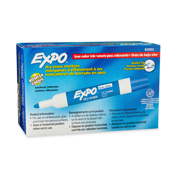 Expo Whiteboard Marker Dry Erase Bullet Tip Blue Bx12 is specially formulated low odour ink, ideal for classrooms, small offices, and homes