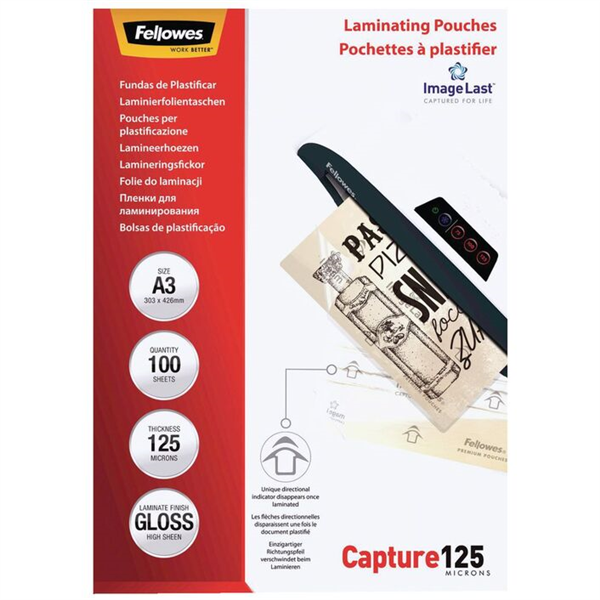 Fellowes 53075 Laminating Pouches A3 Gloss 125 Micron Pack 100