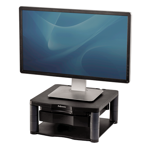 Positions the monitor at a comfortable viewing height and helps organise the workstation around the monitor