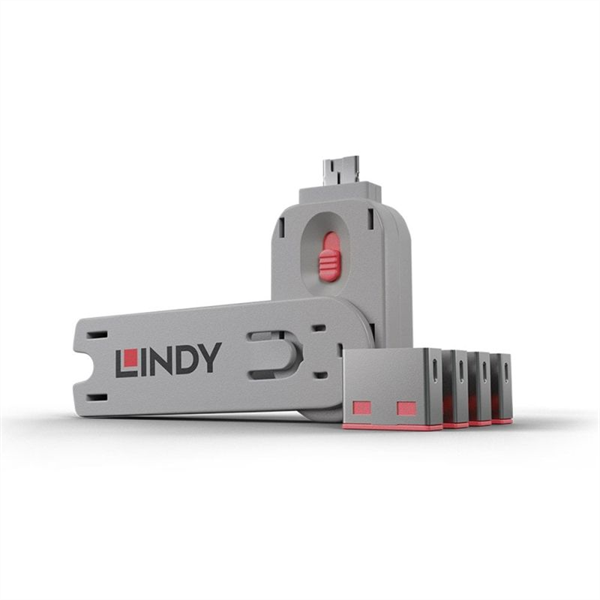 About Lindy USBA Port Block/Key x4 P The USB Port Blocker is made up of a combined 'key' and 'lock' assembly which plugs into the USB port and physically blocks access to it