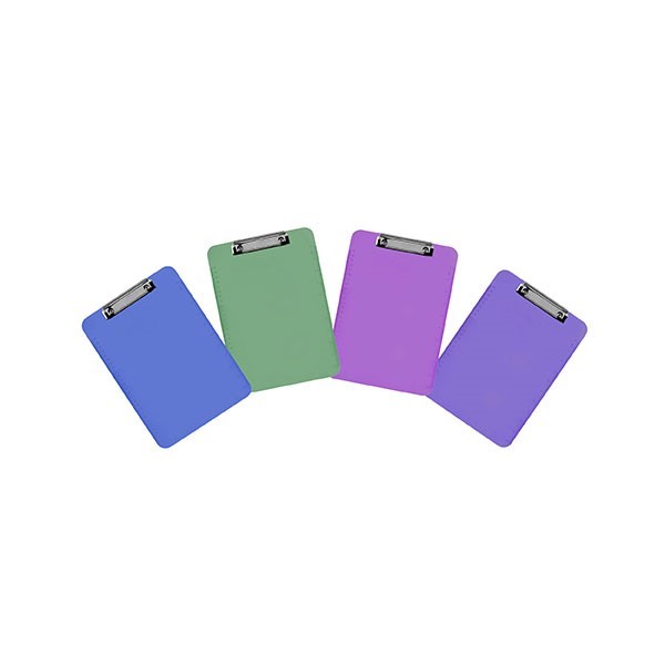 Bright plastic clipboards with quality metal clips and retractable hanging hook.