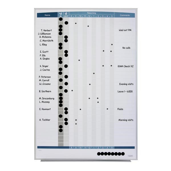 Keep track of your employees itinerary with this durable magnetic in/out board