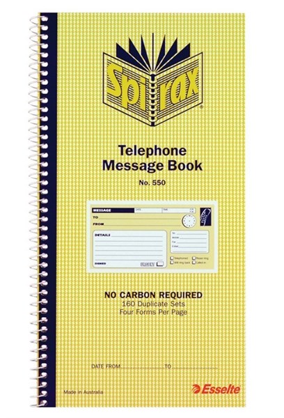 Spirax 550 Duplicate Carbonless 4 to View Telephone Message Book 144 x 272mm