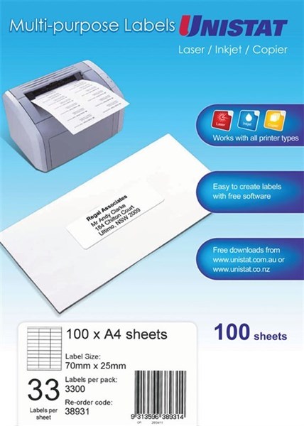 Unistat 38931 Laser Inkjet Copier Labels 70 x 25mm 33 Per Sheet Box