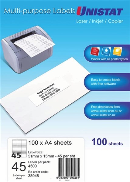 Unistat 38948 Labels Laser Inkjet Copier 51 x 15mm 45 Per Sheet Box 100
