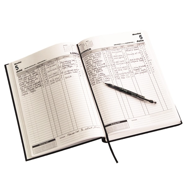 A quality case bound, section sewn book, 2 pages to a day (lunch/dinner)